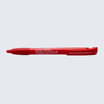 Restposten: Es handelt sich hier um eine Kiste mit 500 roten Kugelschreibern und dem Aufdruck: „Kein Spiel ohne Regeln“ mit der Webseite der Automatenwirtschaft.de auf dem Clip.